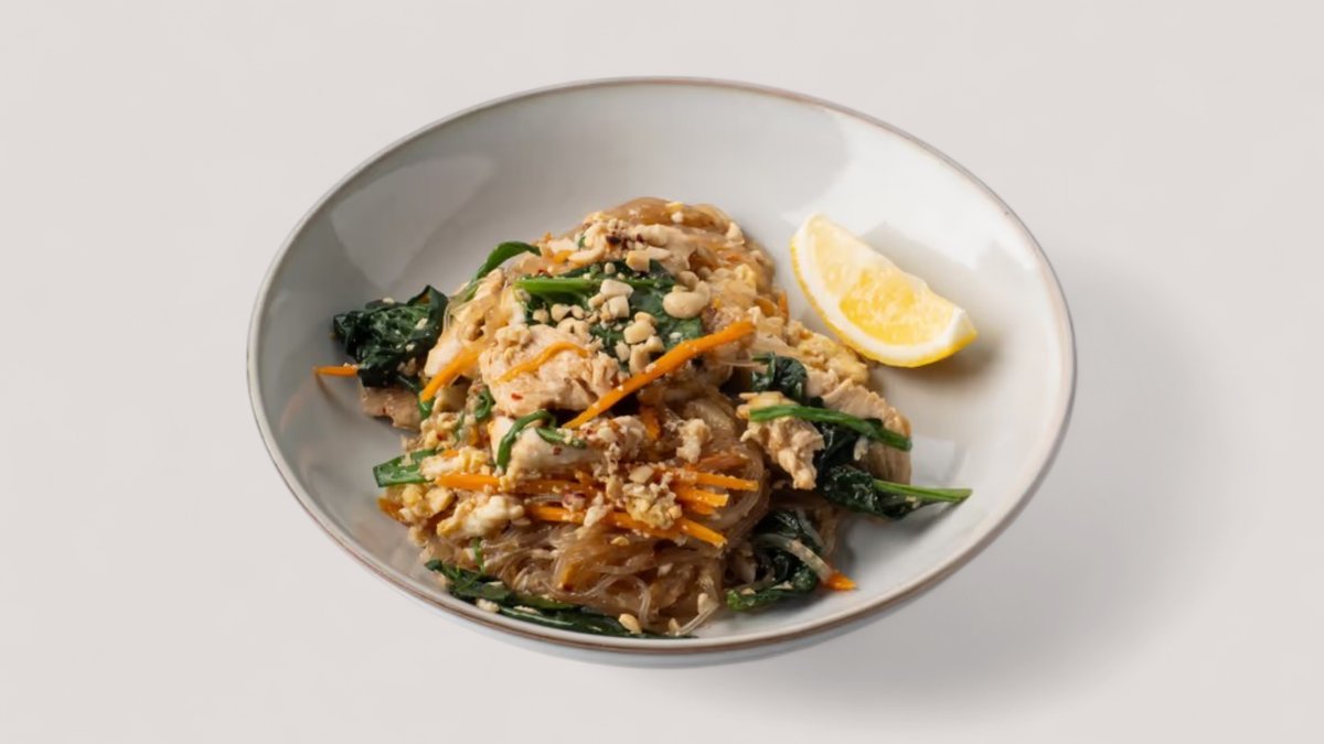 Стеклянная лапша с курицей, с обжаренными овощами, специями и арахисом