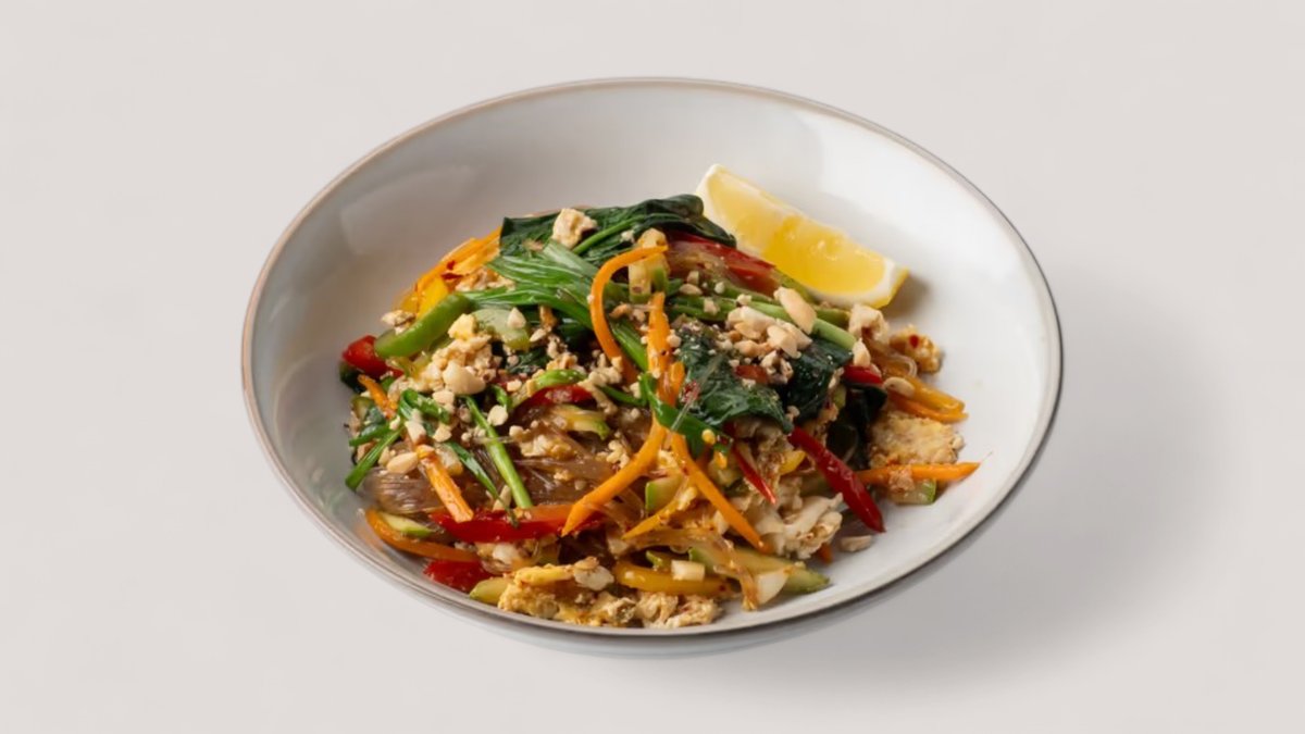 Стеклянная лапша с тофу, с обжаренными овощами, специями и арахисом