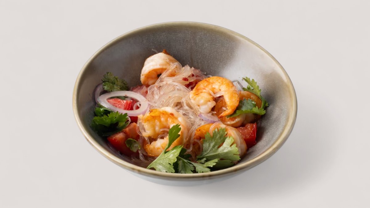 Креветки с прозрачной лапшой с помидорами, луком шалот, чесноком специями и арахисом.