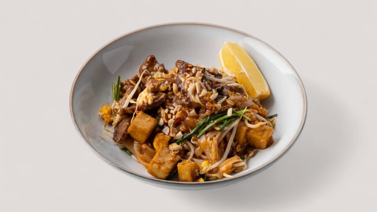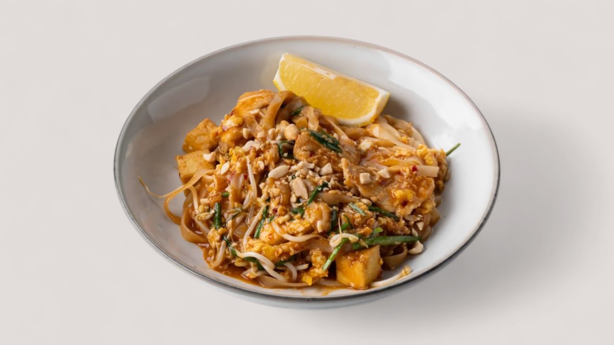 Тайская лапша, жареная с тофу, приправами, бобами и арахисом