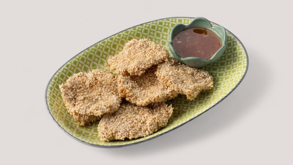 Жаренные креветки в кляре с кунжутом и кисло-сладком соусе