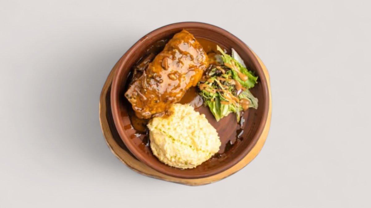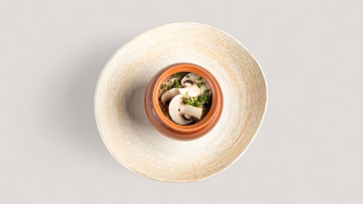 Гречка, говядина, лук, шампиньоны, грибной соус, сливочно-чесночное масло