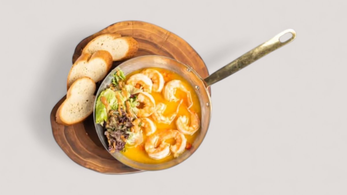 Креветки очищенные, багет, чеснок, соус на основе сливочного масла, перец чили, специи