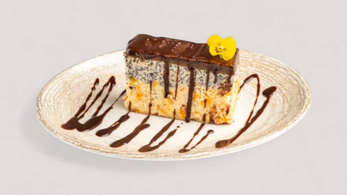 Творог, пшеничная мука, мак заваренный на кукурузном крахмале и сахаре, лавандовый соус, яблоко ,груша