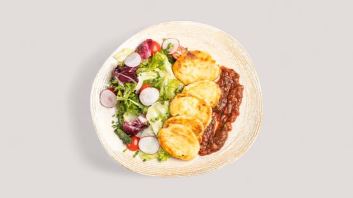 Сыр халуми, соус, масло оливковое, редис, салат листовой, томаты, лук зеленый
