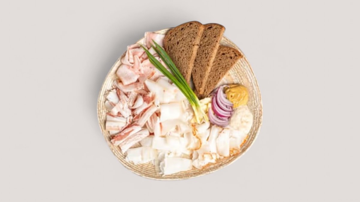 Алматинское сало, бородинский хлеб, лук, горчица, хрен, чеснок