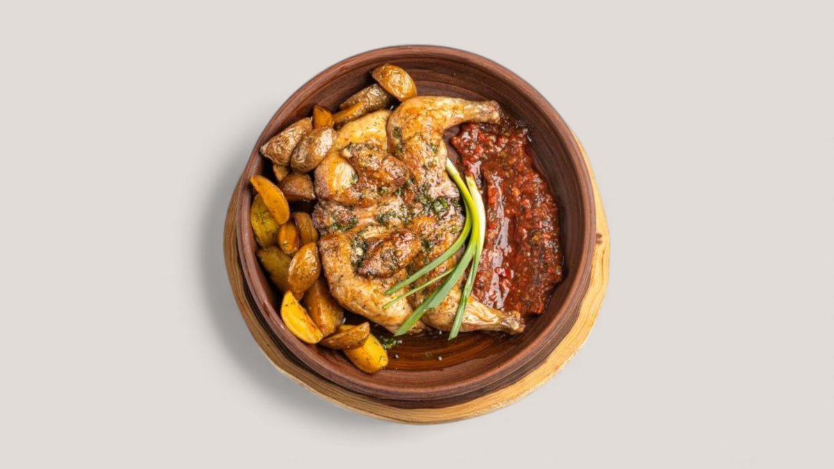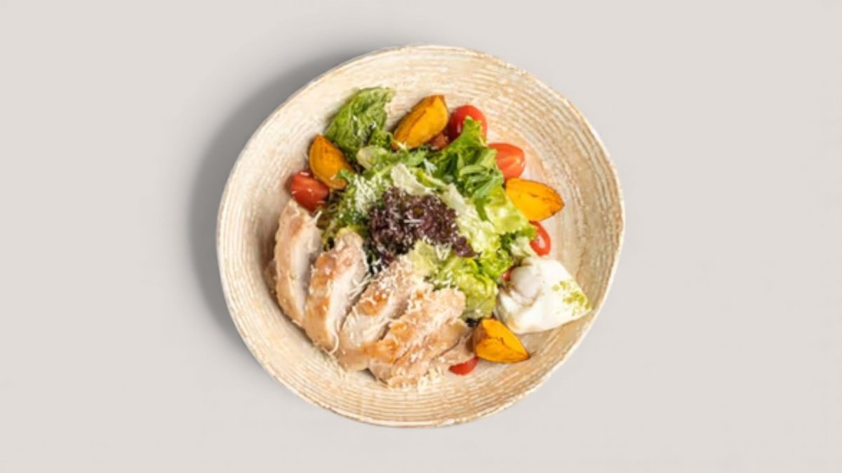 Микс зелени, обжаренный картофель, помидоры, яйцо куриное, филе цыпленка, брынза, медово-горчичный соус.