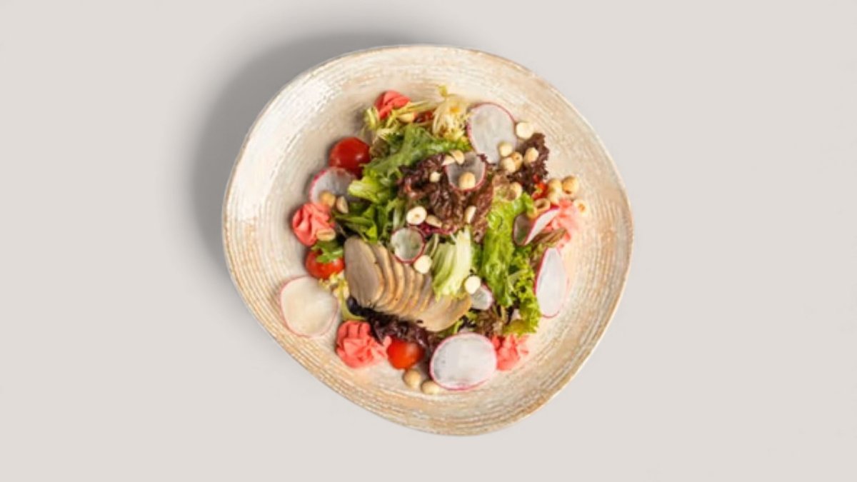 Свекла, чиз крем, филе утки, салат листовой, соус, мед, фундук
