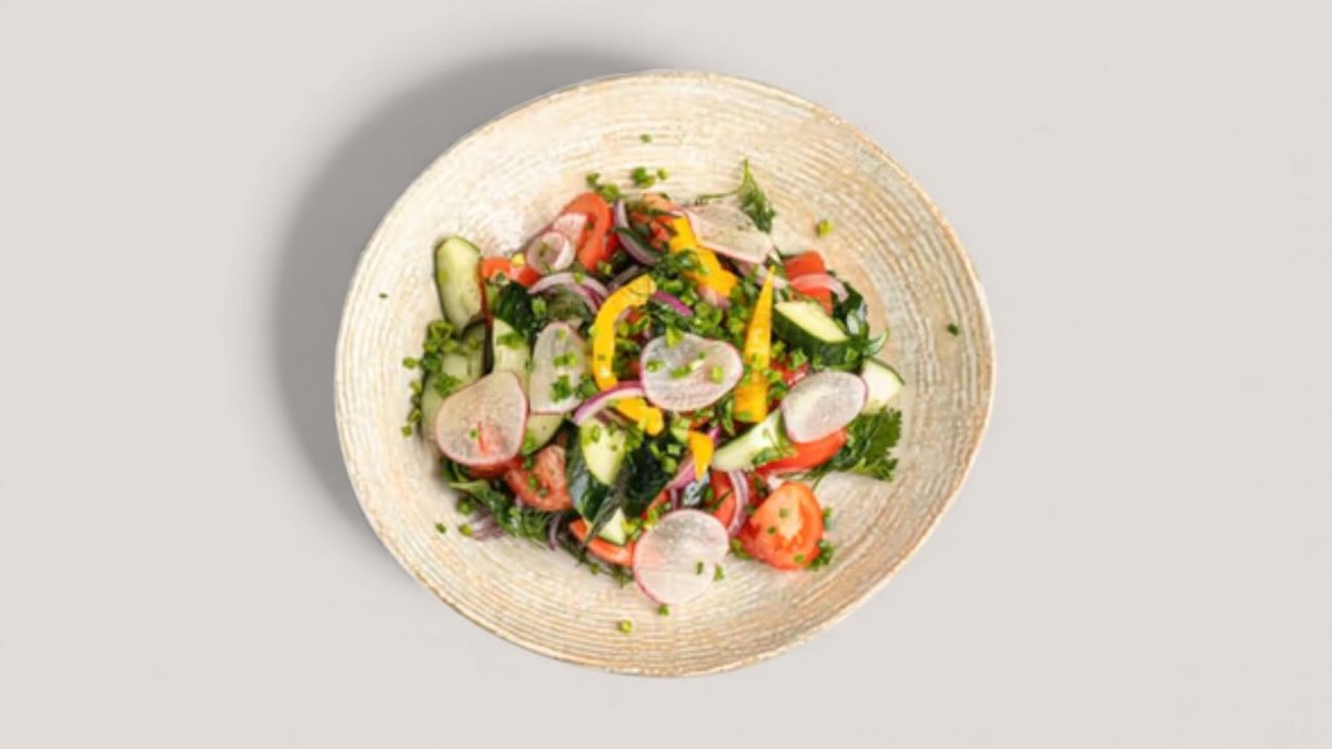 Томаты, огурцы, перец свежий, лук, редис, зелень, специи, заправка на выбор