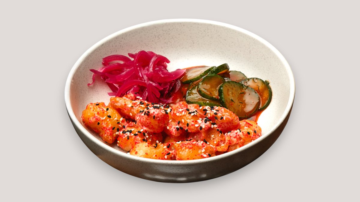 Кальмар в пивном кляре обжаренный во фритюре . Подается с огурцами Ким чи (огурцы , Ким чи соус , чеснок , кинза ) И пикантным соусом на основе майонеза , кунжутного масла , шрирачи.