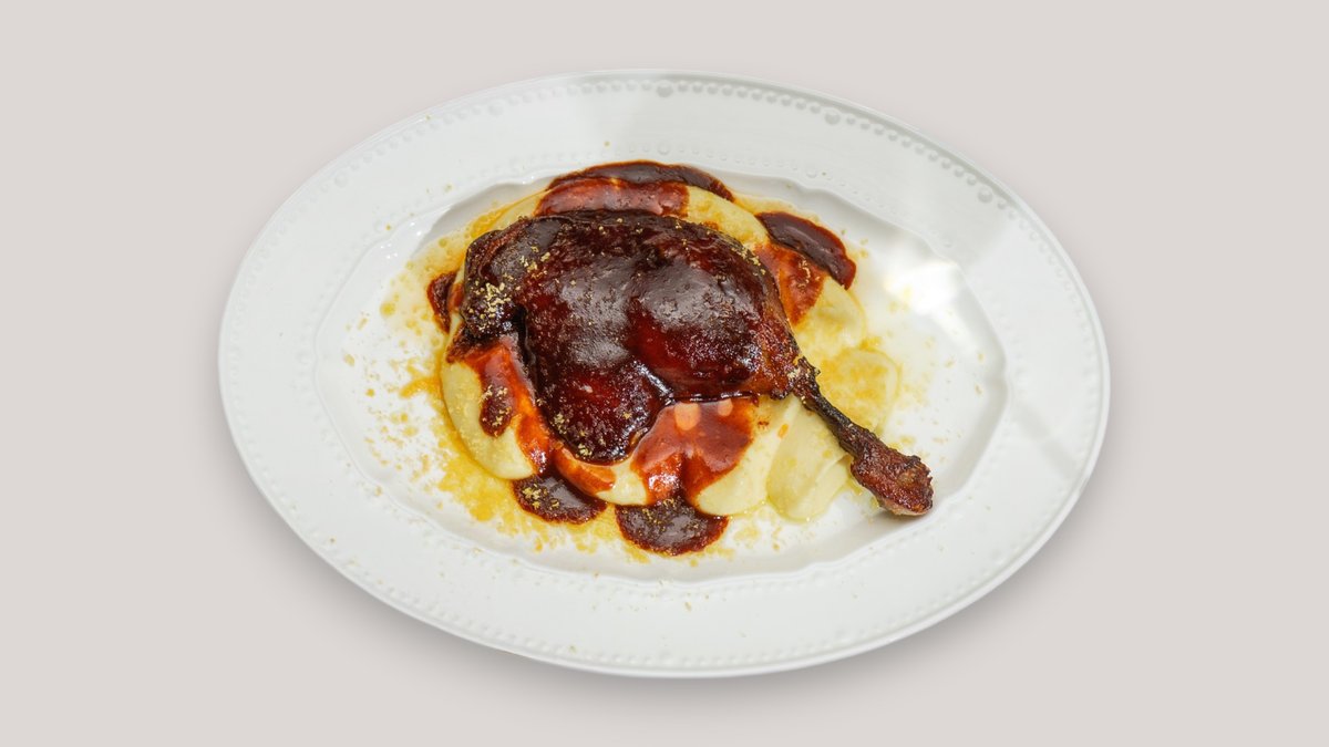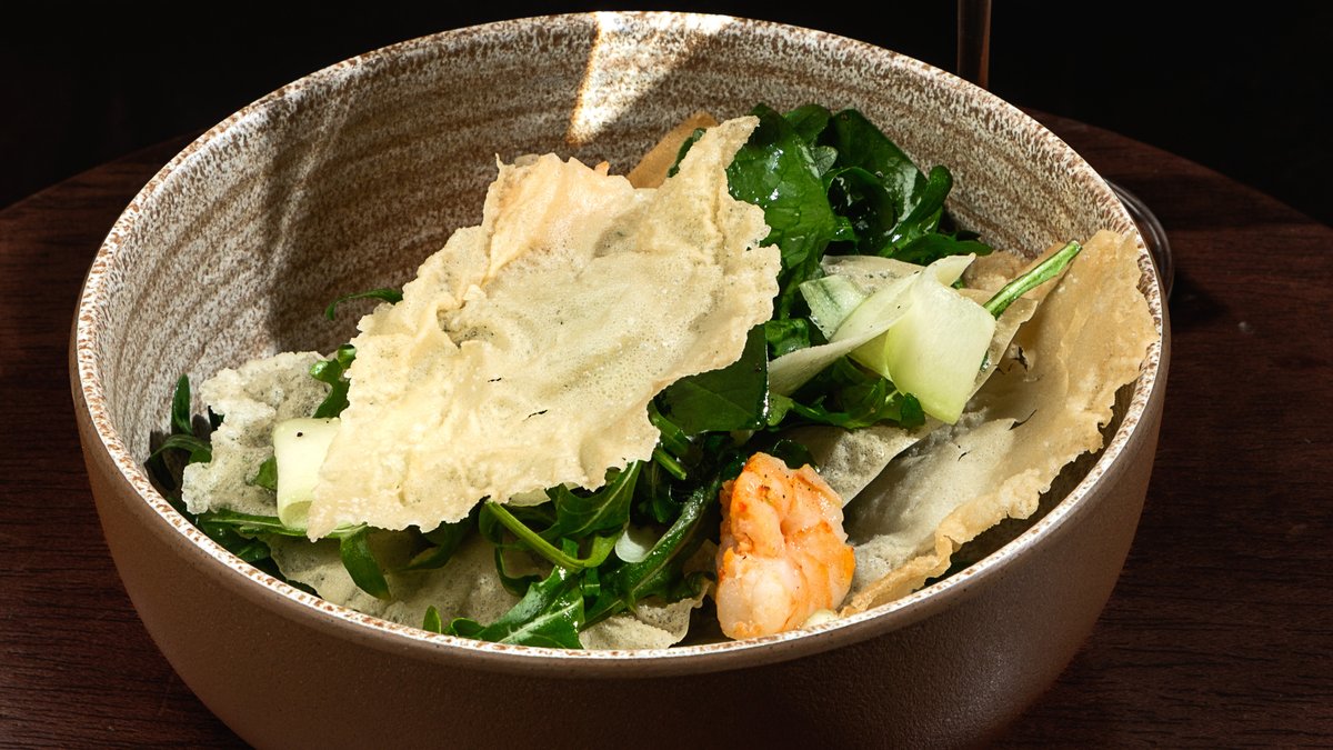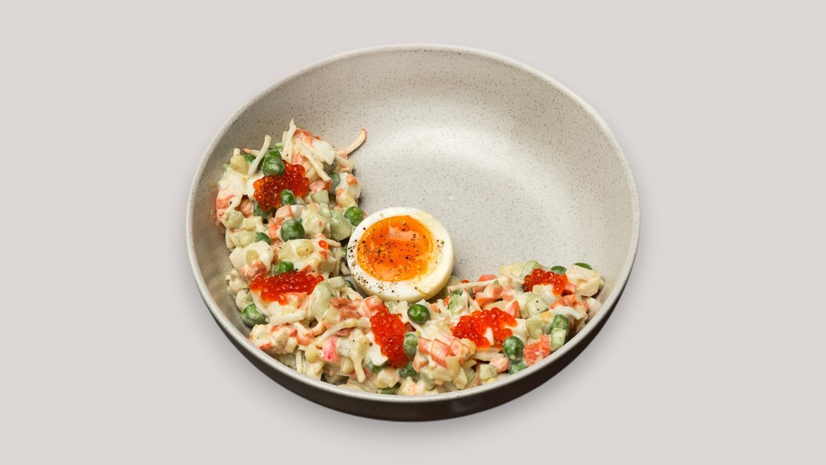Классический салат Цезарь из листьев мини-романо с фирменным соусом на основе куриного желтка, анчоусов, каперсов и сыра пармезан.В салат добавляется цыплёнок, обжаренный в сухарях панко, а также хрустящая посыпка панкратата на основе сухарей панко, сушёной бастурмы, пармезана и тимьяна.Подаётся с яйцом всмятку с жидким желтком, тертым пармезаном и оливковым маслом.