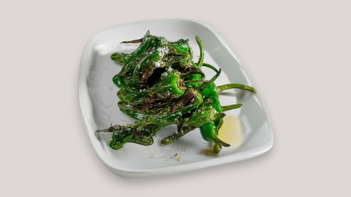 Испанские не острые перцы обжаренные на открытом огне . Дополненные морской солью Maldon