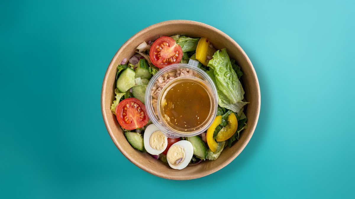 Тунец консервированный , помидоры черри ,микс салата , яйцо перепелиное , огурец , красный лук , перец светофор , соус Франция.