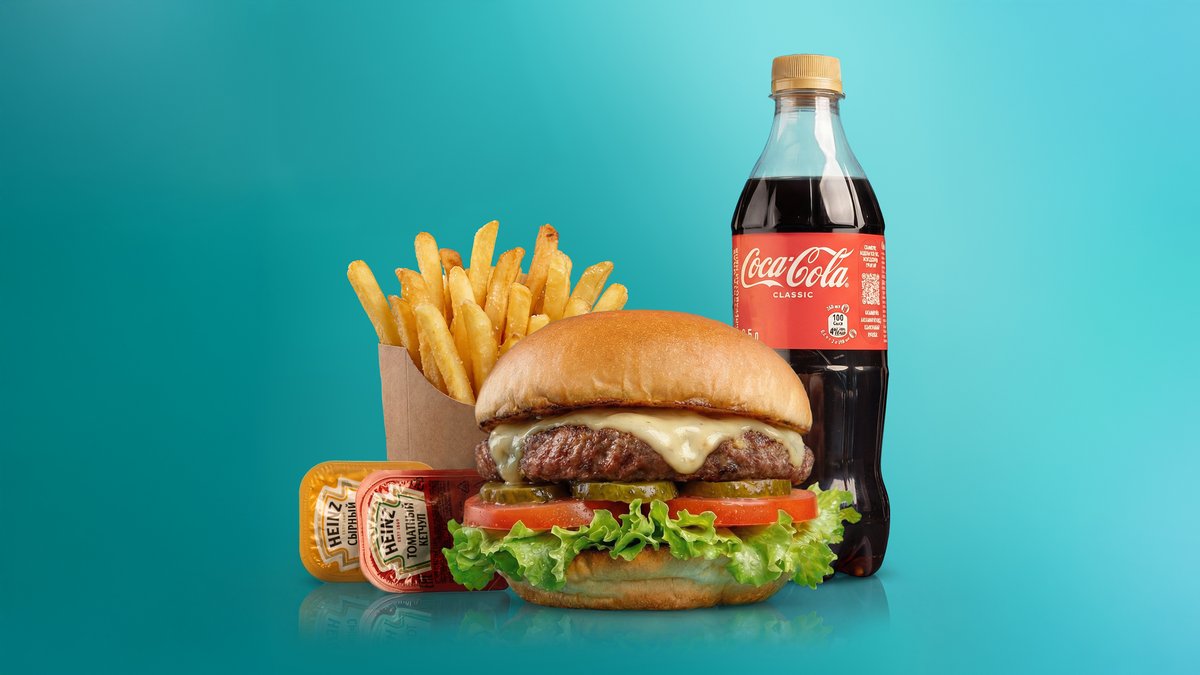 Говяжий бургер + фри + напиток на выбор (кола, фанта, спрайт)