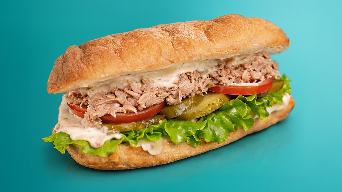Булочка панини, лук, сыр, лист салата, соус айоли с чесноком, паста тунец, маринованный огурец, помидор