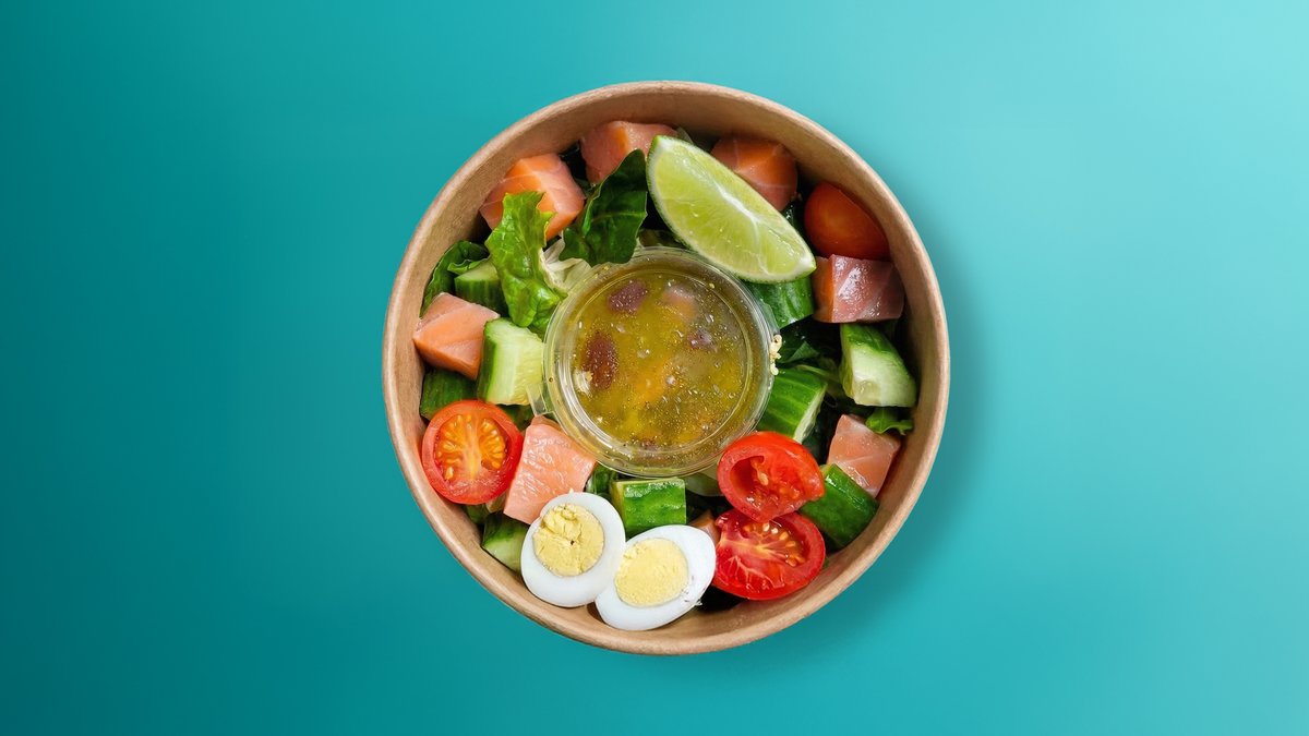 Семга соленая, помидоры черри, микс салата, яйцо перепилиное, огурец, лайм, соус Италия (в составе мед)