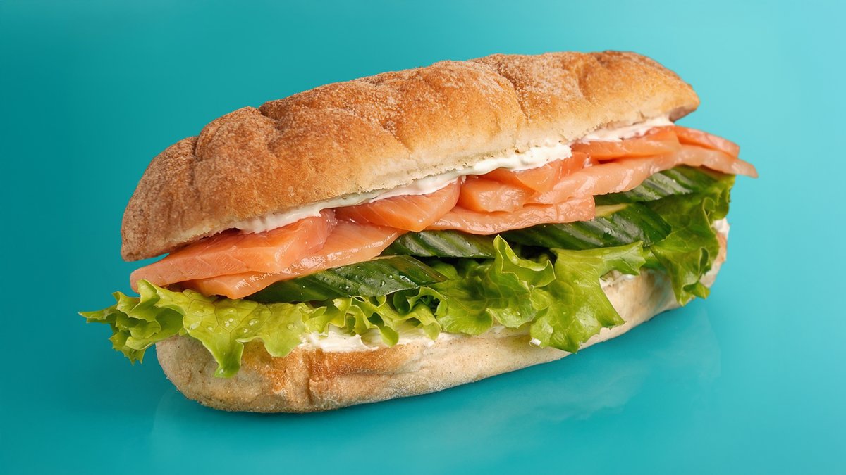 Итальянский сэндвич на хрустящей чиабатте с семгой, листом салата, свежим огурцом и творожным сыром