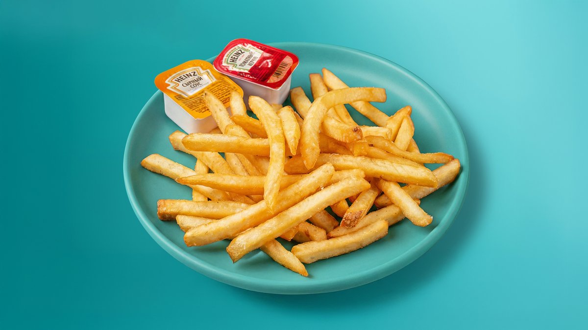 Порция хрустящих, золотистых, обжаренных в растительном фритюре и слегка посоленных соломок отборного картофеля.