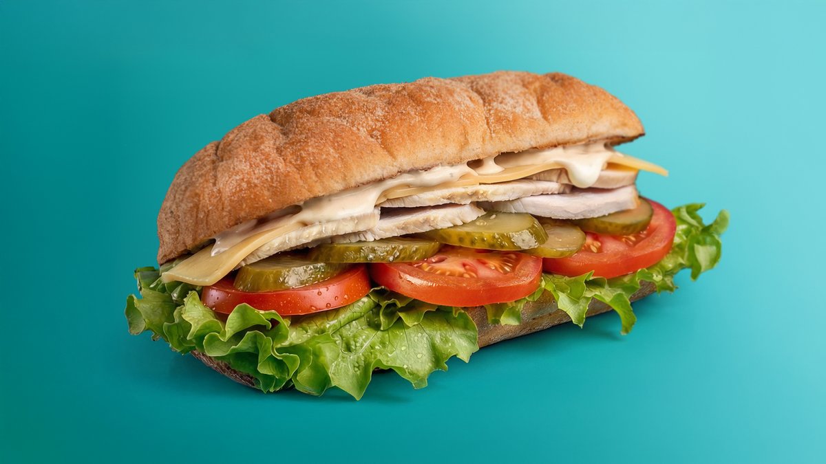 Итальянский сэндвич на хрустящей чиабатте с индейкой, помидорами, сыром, огурцом и соусом айоли