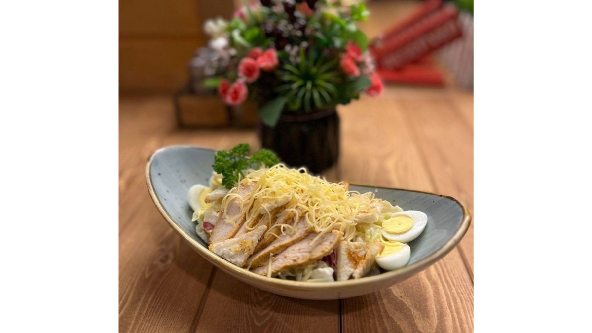 Лапша, яйцо, запеченное курица, сёмга, грибы, шампиньоны, нори, кунжут, соевой соус