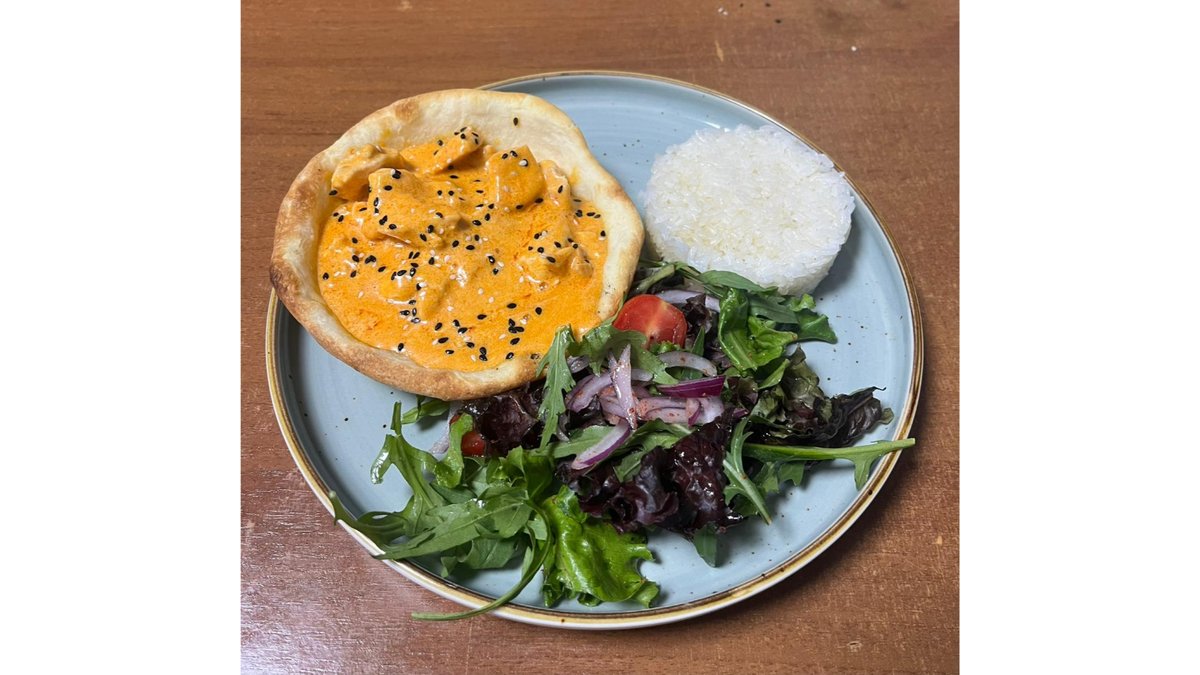 Курица, паста Карри, хлебная корзина, рис, лола-росса, лист салата, руколла, красный лук, чери