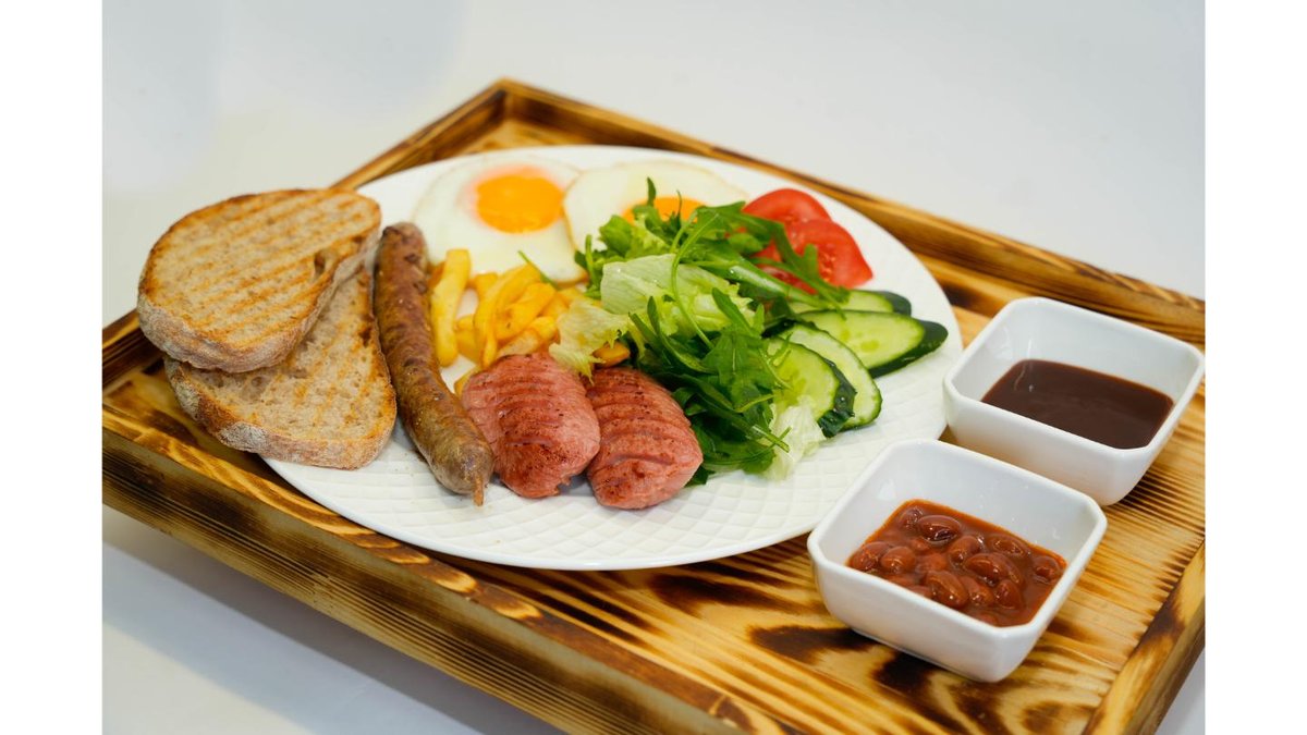 Глазунья Из Двух Яиц С Говяжей Колбаской Гриль, Говяжей Порезанной Сарделькой, Красной Фасалью И Соусм Барбекю. Подается С Двумя Кусочками Отрубного Хлеба, Салатом Микс, Картовелем Фри. Дополняется Завтрак Свежей Овощной Нарезкой