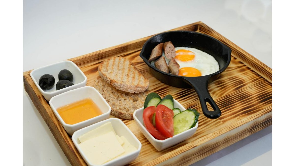 Глазунья Из Двух Яиц На Сливочном Масле. Говяжие Колбаска, Свежие Овощи, Брынза, Поджаристый Хлеб