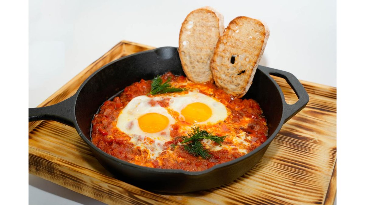 Глазунья Из Трех Яиц, Лук Репчатый, Перец Болгарский, Помидор, Томат, Чеснок, Кинза, Хлеб Отрубной