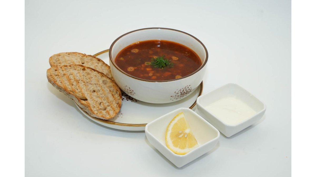 Насыщеный Суп С Копченой Колбасой, Сосиски Куриные, Отварная Говядина, Лук, Маслины, Маринованые Огурцы, Томатная Паста. Подается Со Сметаной, Лимоном И Поджаристым Хлебом