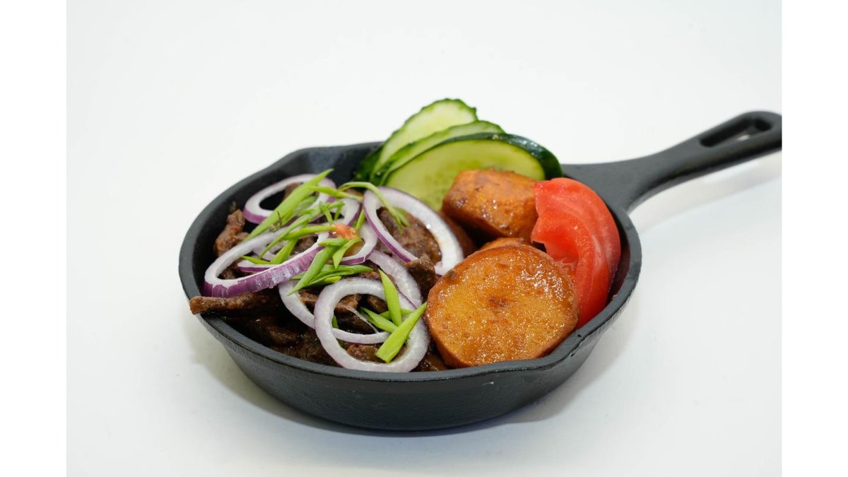 Говяжий Филе, Лук, Картофель Обжаренный, Помидор, Огурцый, Соевый Соус, Зелень