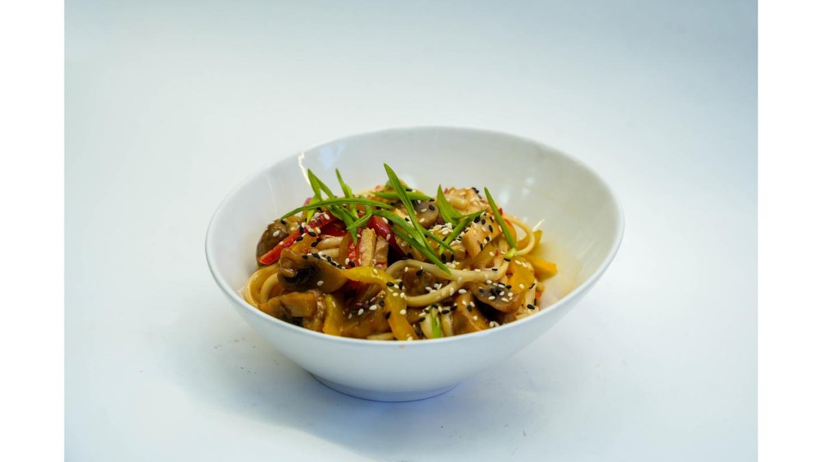 Лапша Удон, Куриное Филе, Овошной Микс, Лук Зеленый, Кунжут, Кунжутное Масло