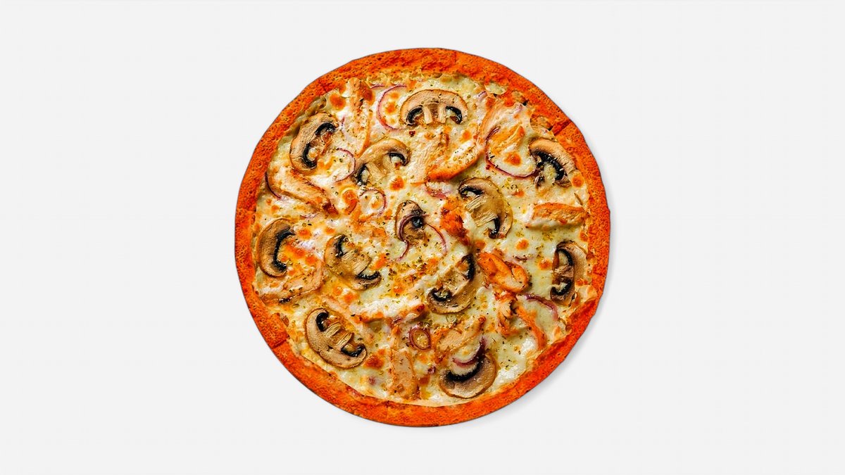 Дрожжевое тесто, томатный соус, сыр моцарелла, шампиньон, куриная грудка