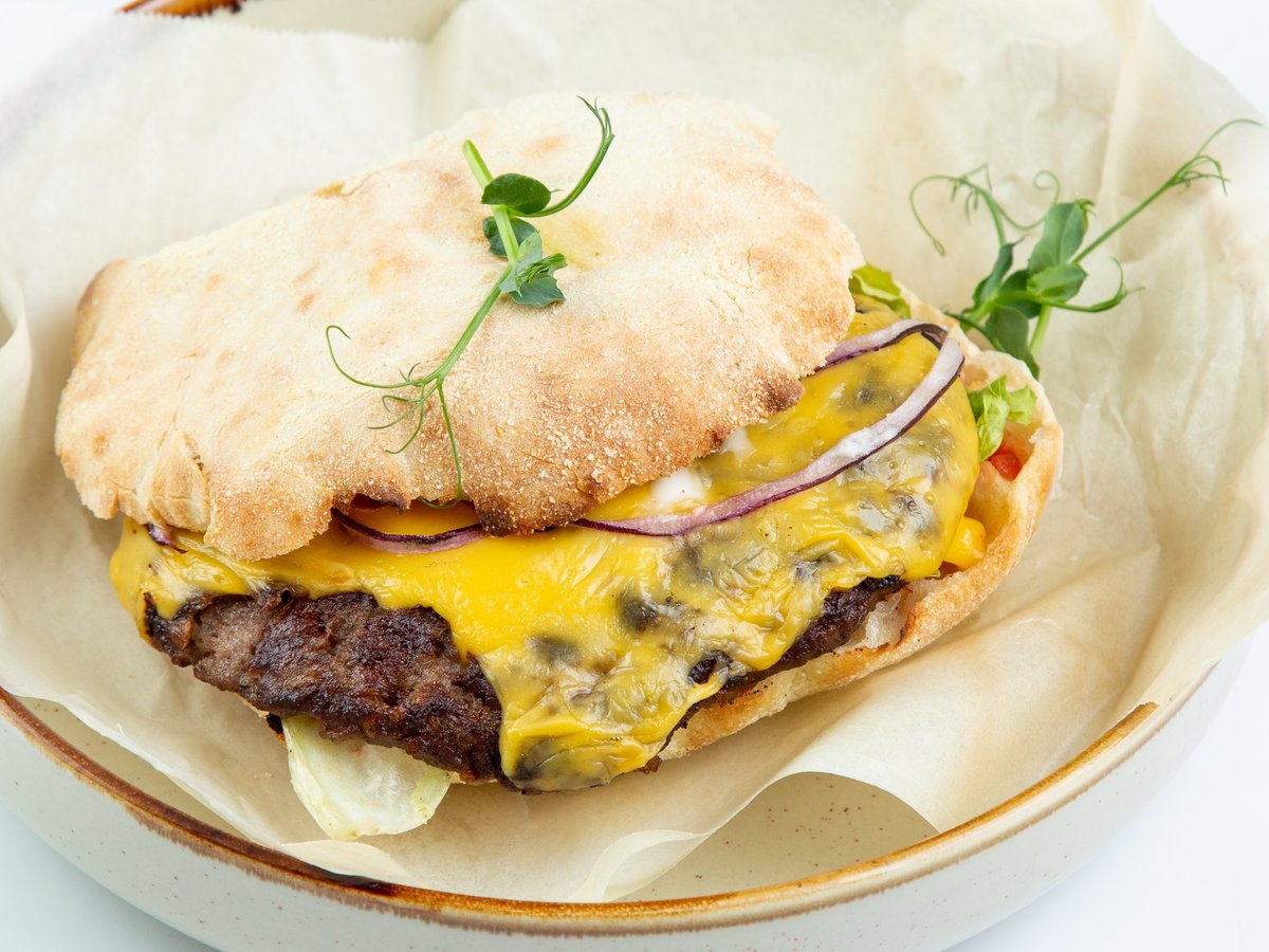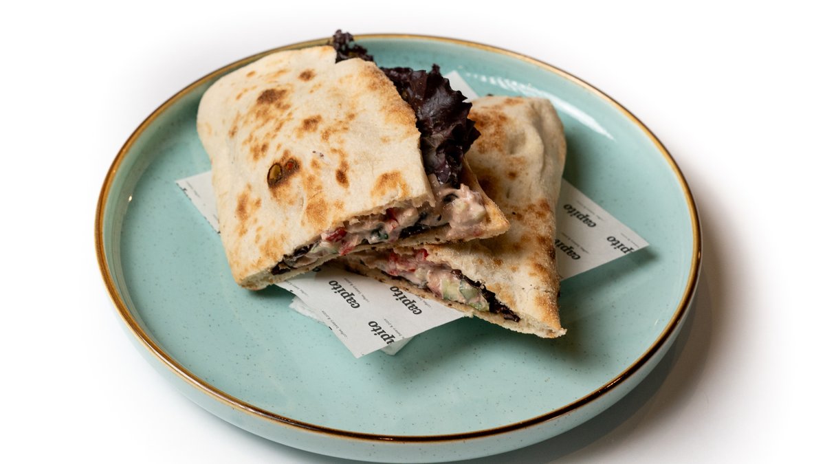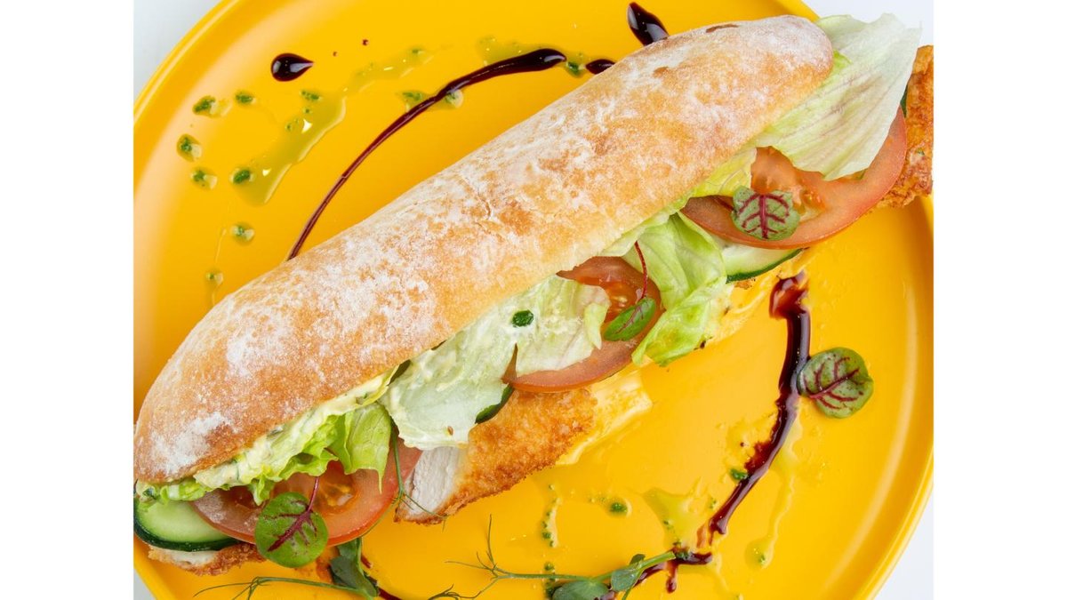"Круассан, соус тартар, куриное филе, томаты и лист салата."