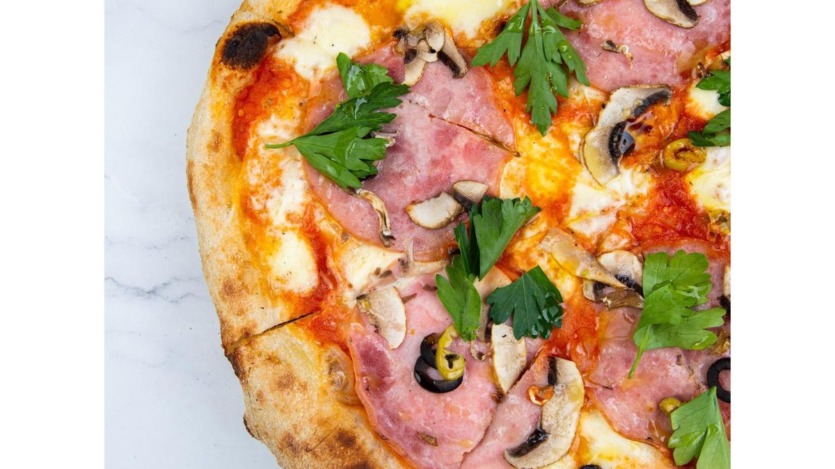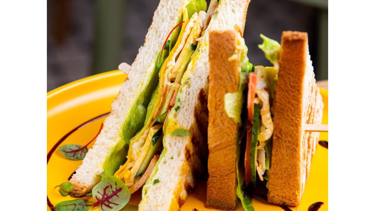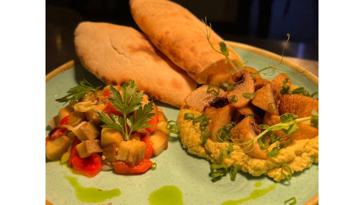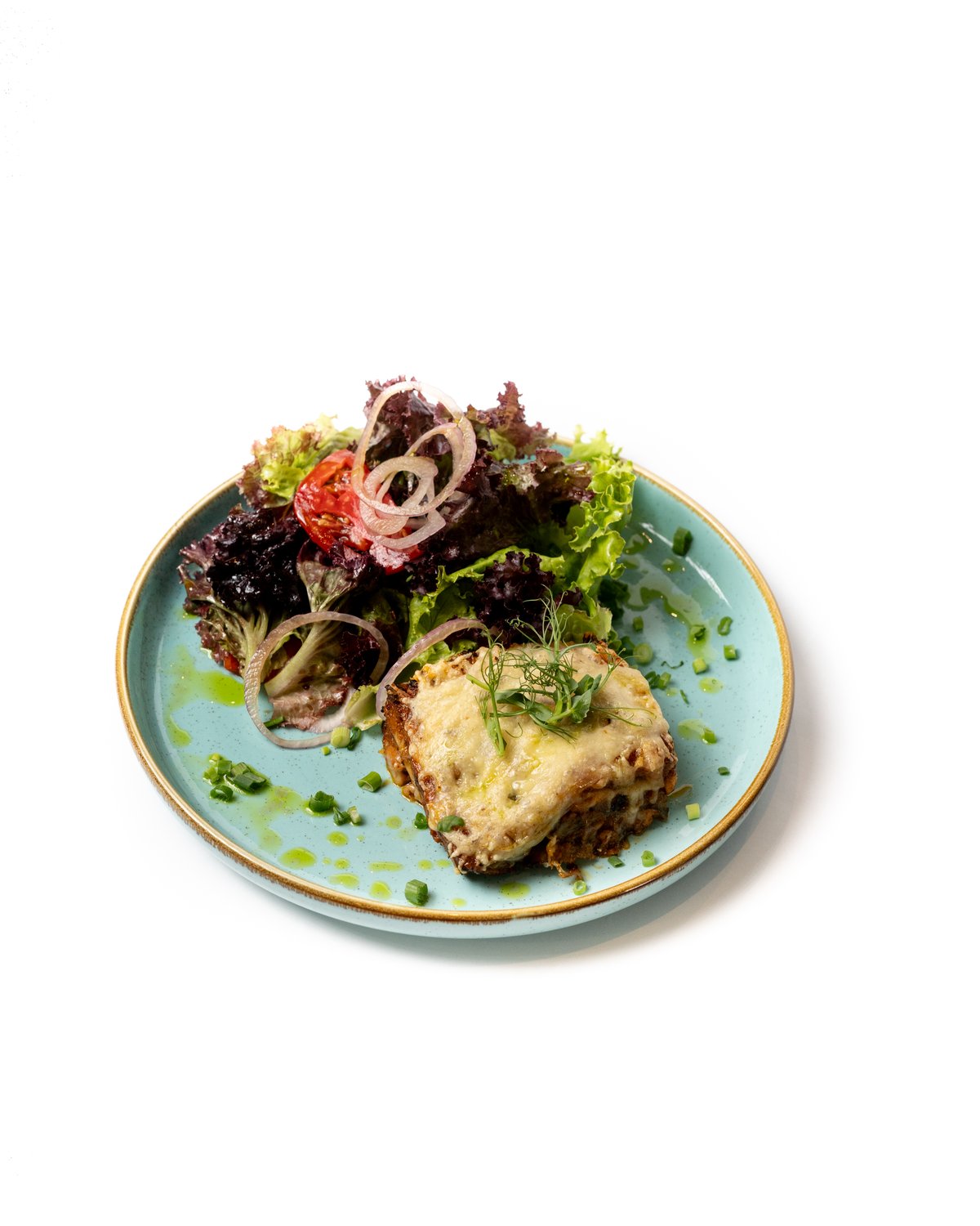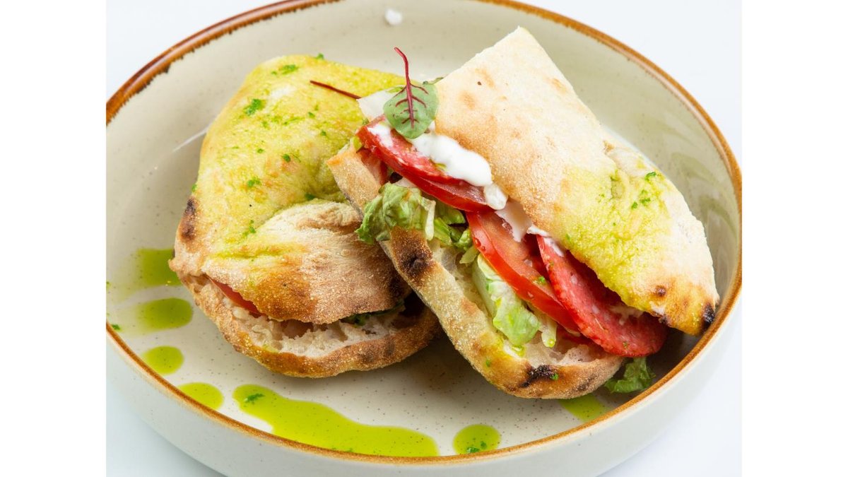 "Свежий и сытный мини-багет с говяжьей ветчиной, сочным омлетом, обжаренным картофелем с грибами. Подаётся с салатом из свежих томатов, шпината и кедровых орехов."