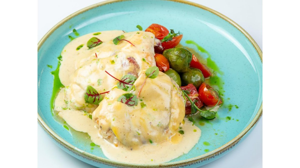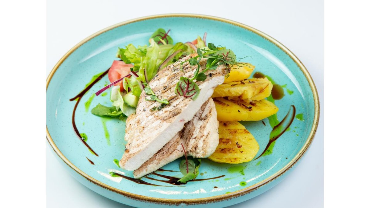 Нежное куриное филе на гриле,дополненное запеченными слайсами и прправленное ароматнаым сливочным маслом
