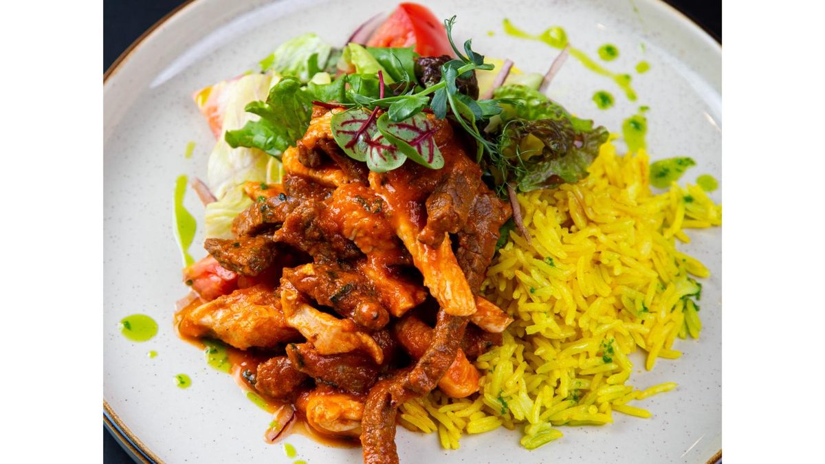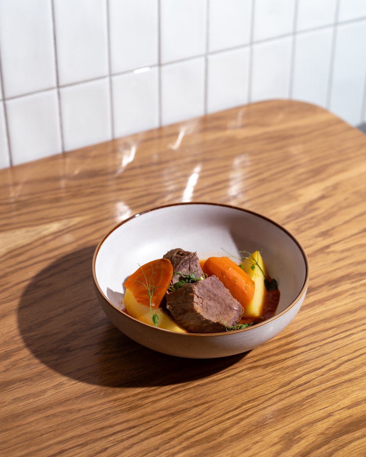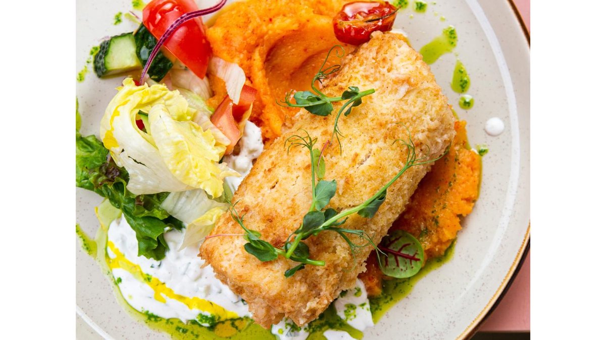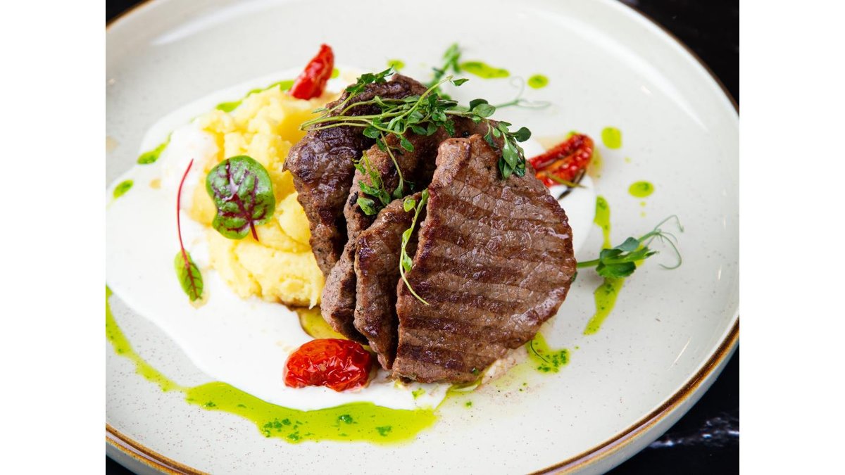 "Сытное и питательное сочетание говяжьей ветчины, жареного картофеля, отварных яиц и свежей зелени с овощами."