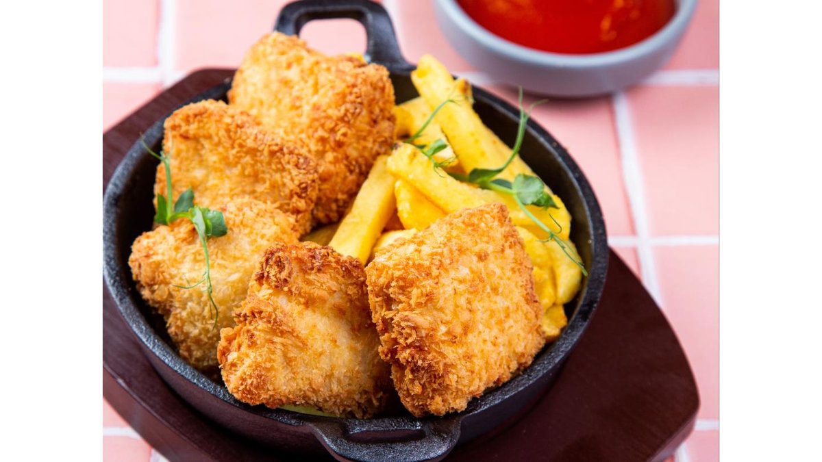 Филе куриной грудки в хручтящей панировке ,обжаренной масле ,подается с картошкой фри и кетчупом