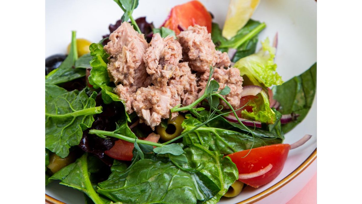 Полезный салат на основе консервированного тунца ,свежих томатов ,маслин ,ошливок и красного лука ,заправленный оливкрвым маслом и апельсиновой заправкой