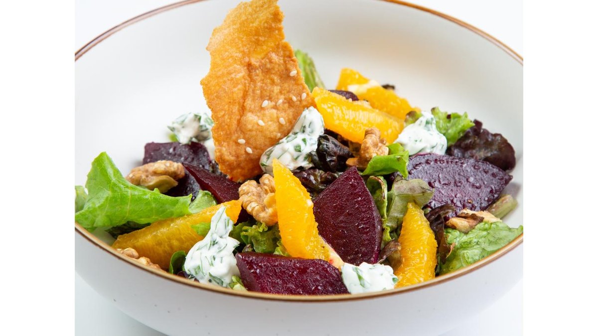Салат на основе темленой свеклы ,мякоти апельсина в сочетании с сырным мусом и грецкими орехами .Заправленный цитрусовым соусом .Подается с микс салатом