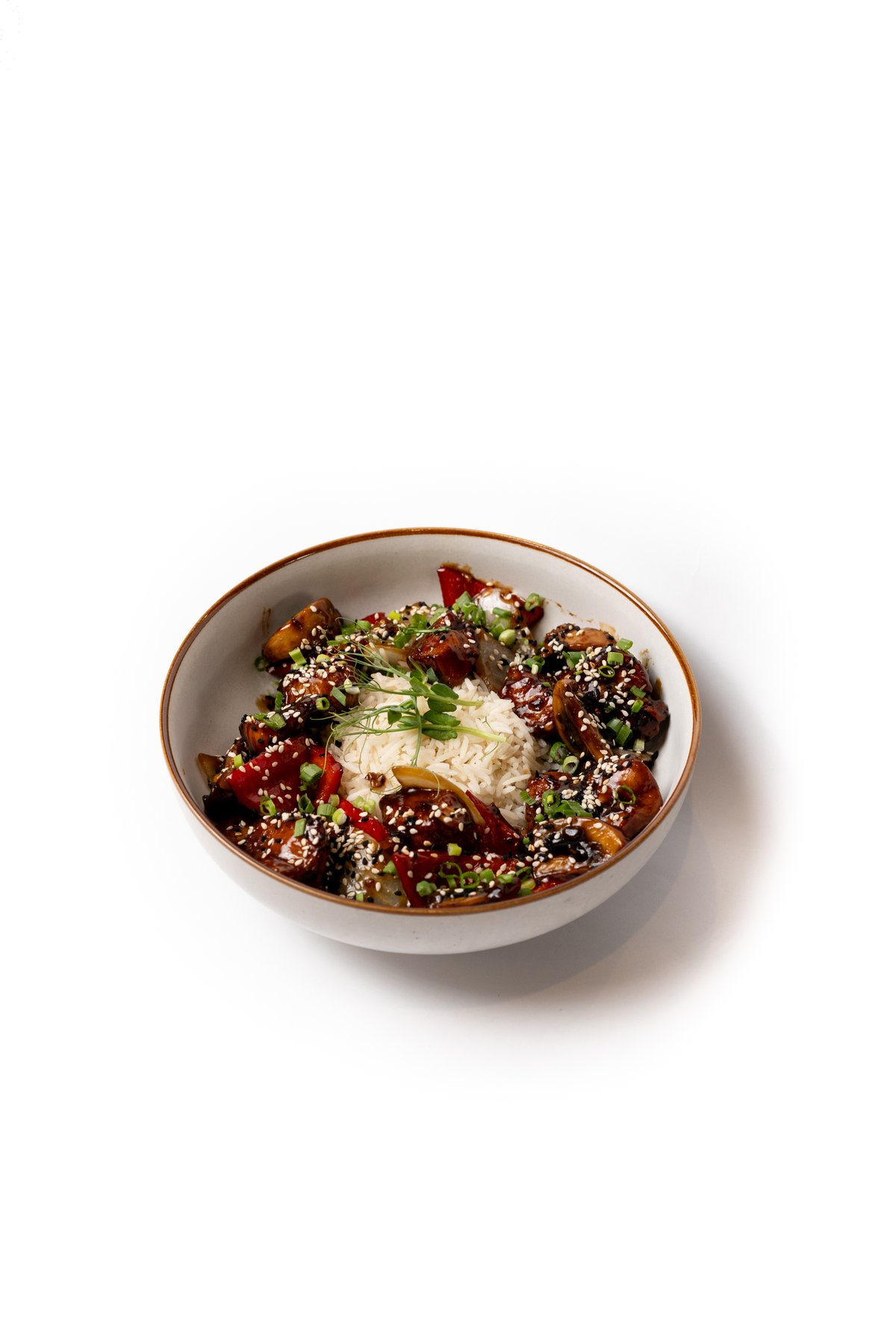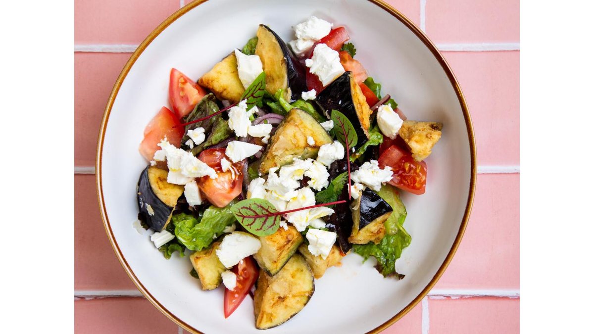 Пикатный салат из нежных баклажанов в сочетании с турецким сыром,свежими томатами,дистьями салата и лолло россаю.Заправляется кисло-сладким соусом