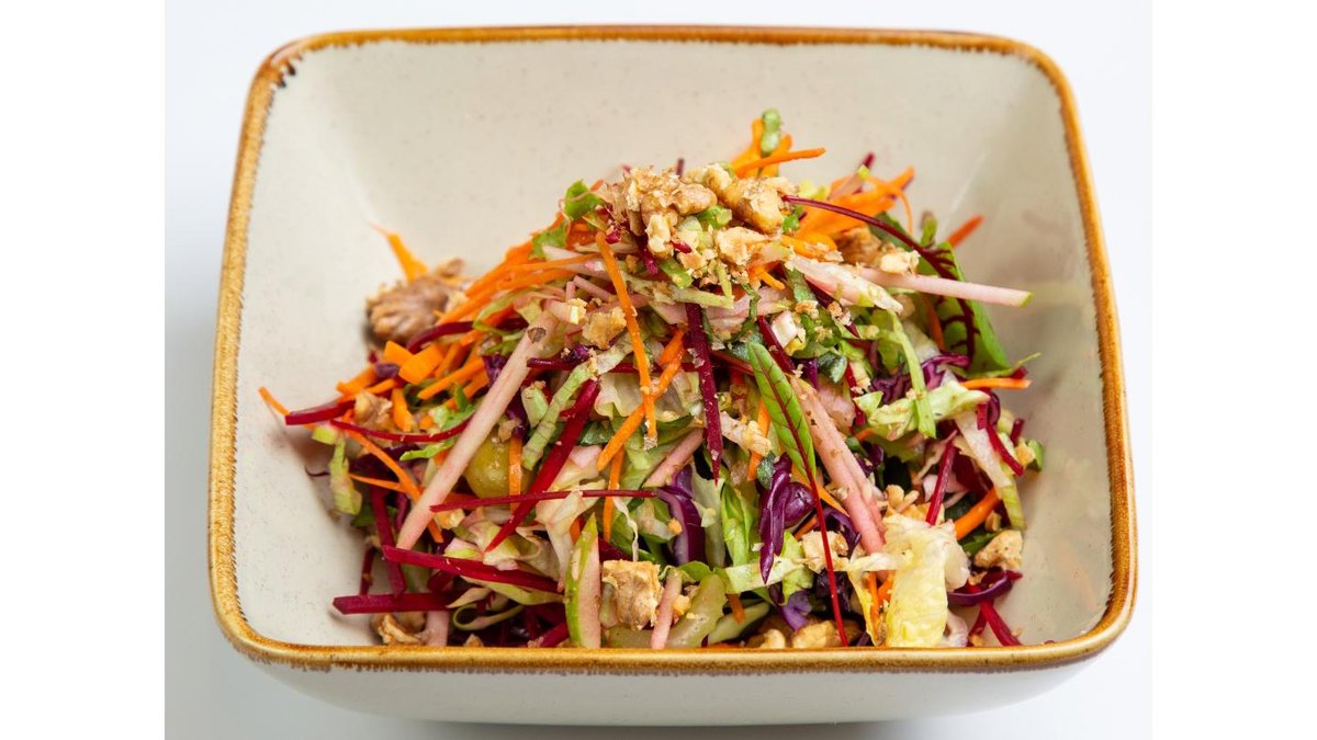 Легкий вегетарианский салат на основе свеклы ,яблоко,моркови,красной капусты ,грецкого ореха,сельдерея ,шпината ,айсберга,оливок ,маслин м лимона