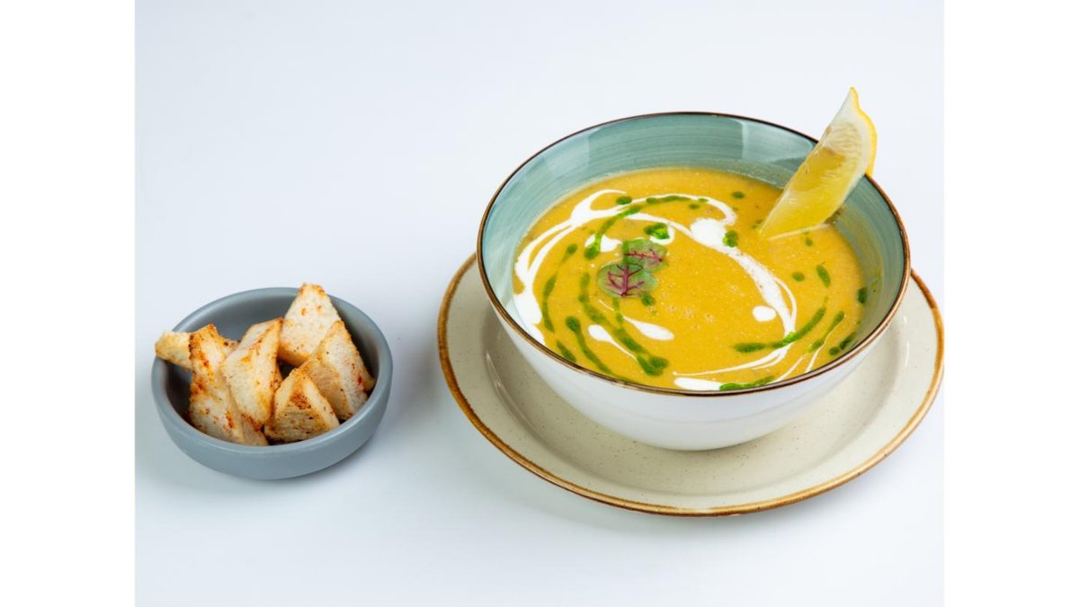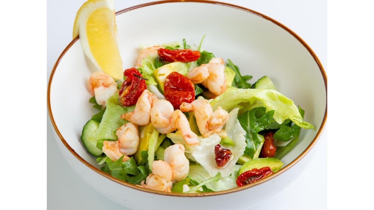 "Легкий завтрак в виде брускетты, включает в себя: скрэмбл из 2-х яиц, креветки на гриле, шпинат, авокадо, помидор и соус Терияки."