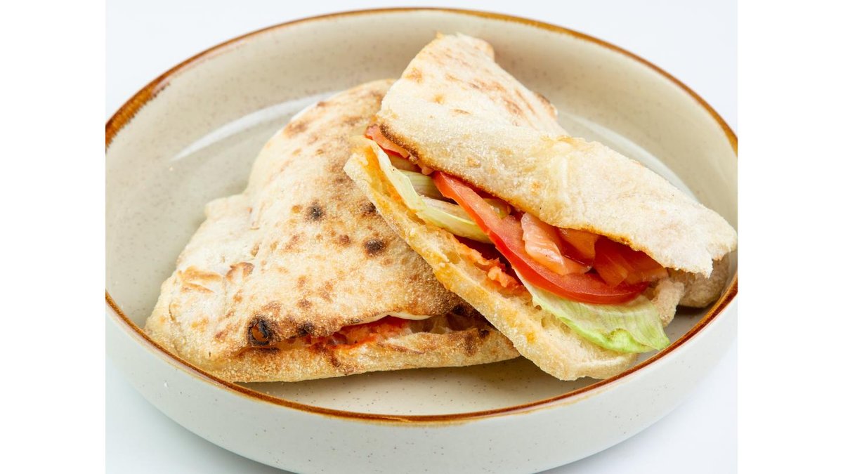 Круассан,малосоленая семга ,крем чиз,соус авокадо ,томаты ,руккола