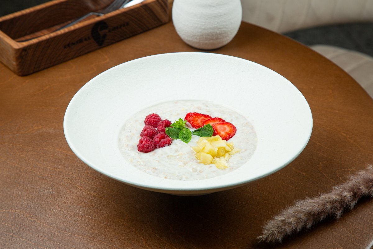 Каша овсяная — питательное и вкусное блюдо, приготовленное на основе овсянки и молока. С добавлением свежей клубники, малины и банана. Каша приобретает сладкий и насыщенный вкус. Украшается мятой, добавляющей свежести и аромат.