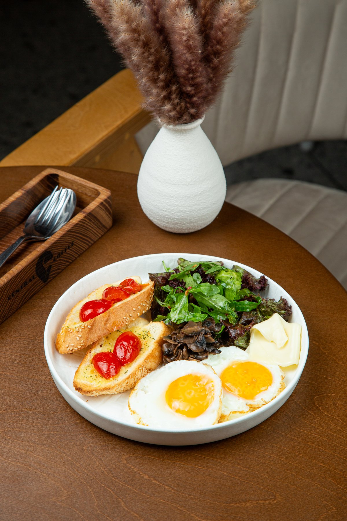Глазунья с томатами — аппетитное блюдо, включающее яичницу-глазунью, поданную с чесночным багетом, вялеными томатами и обжаренными грибами. Гарнируется свежими листьями лоло росса и рукколы, заправленными итальянским дрессингом.