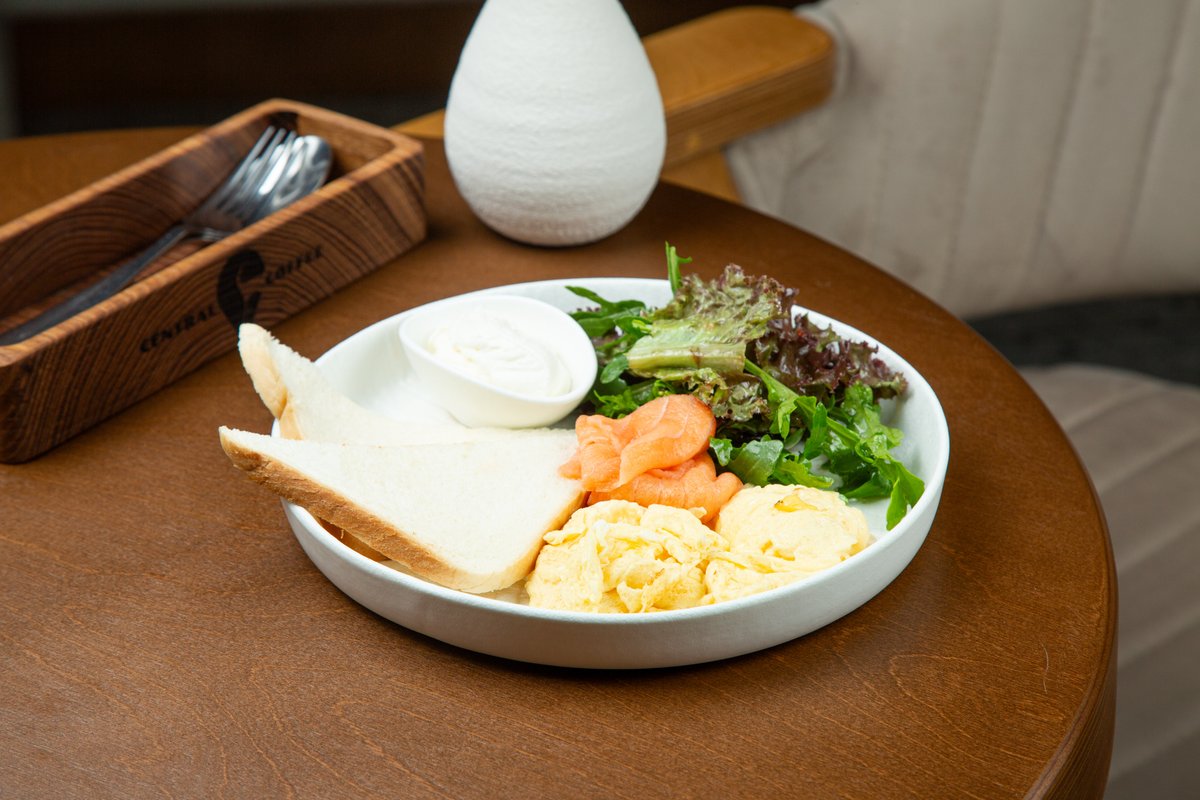 Скрэмбл с лососем — изысканное блюдо, состоящее из воздушного скрембла с ломтиками малосольного лосося и сливочного сыра креметта. Подается с хрустящей зеленью лоло росса и рукколой, ломтиками свежего огурца, заправляется итальянским дрессингом. В комплекте с тостерным хлебом.