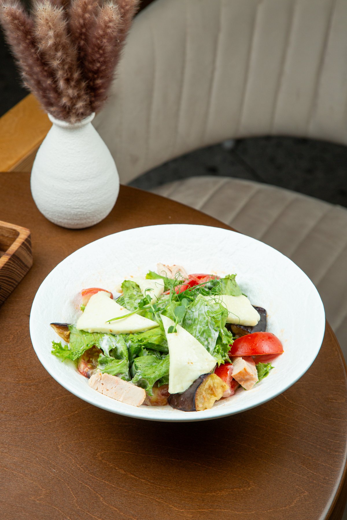 Салат с адыгейским сыром — жареные баклажаны сочетаются с нежным куриным филе, свежими помидорами и листьями салата. Добавляется мягкий сыр брынза, придающий блюду особую пикантность. Заправляется сметаной, что создаёт гармоничное и освежающее сочетание вкусов.