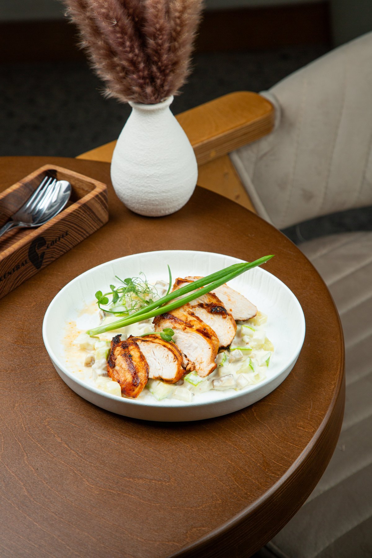 Цезарь с курицей — классический салат, в котором нежное куриное филе подается на подушке из хрустящего айсберга и свежих листьев салата. В салат также входят помидоры черри, перепелиные яйца и сыр пармезан, добавляющие богатство вкуса.