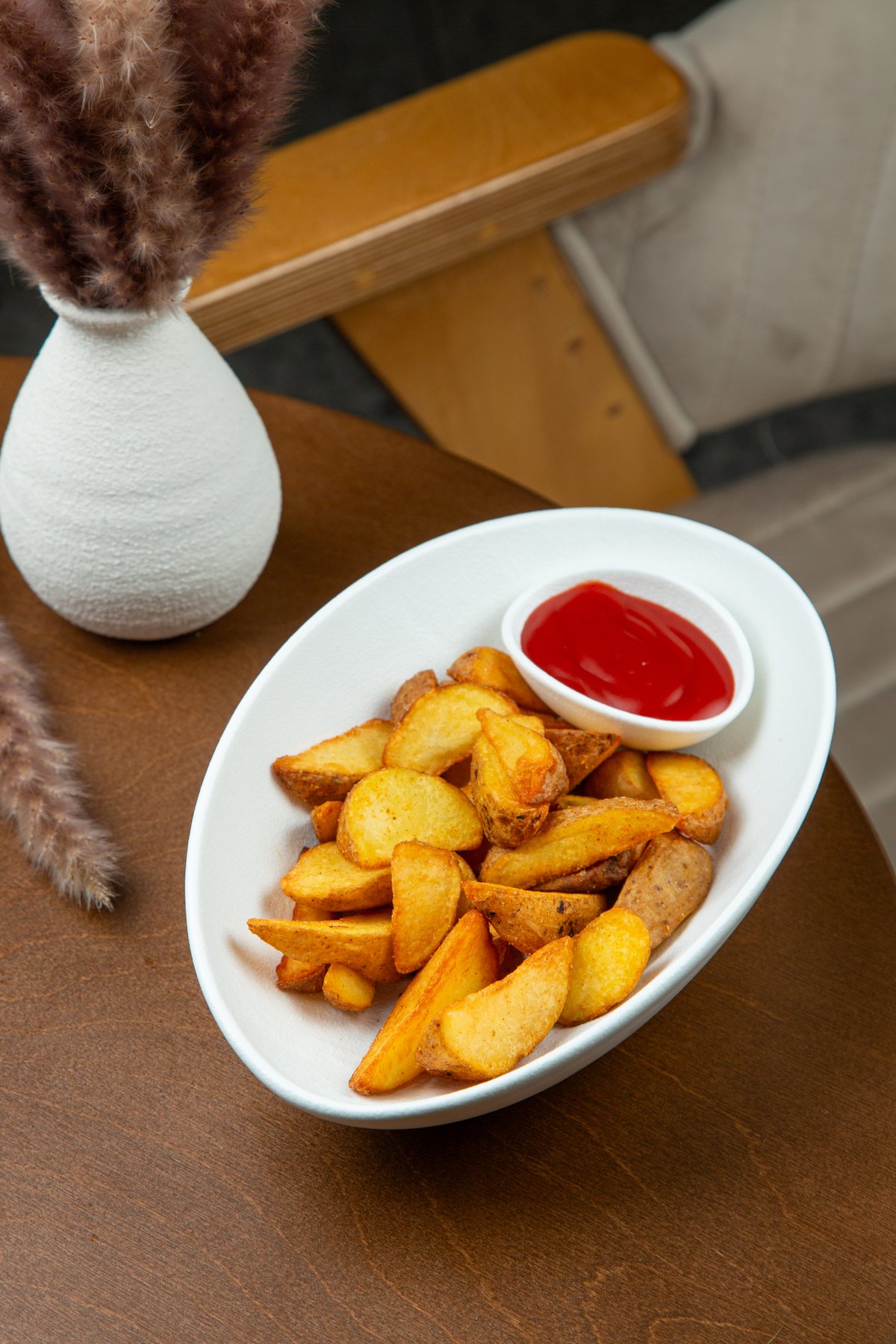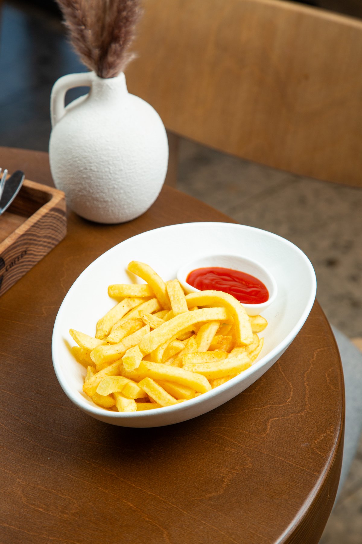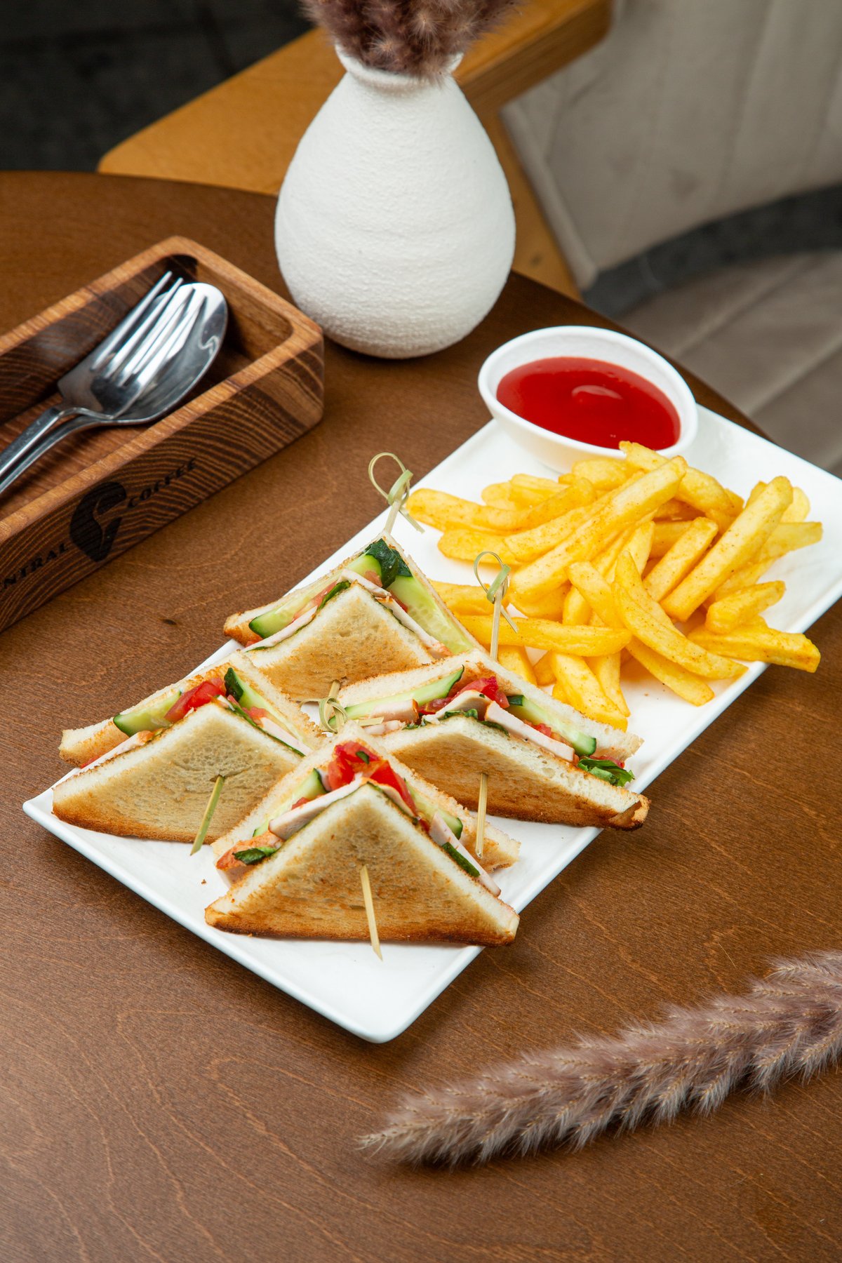 Клаб-сэндвич с курицей — сочное куриное филе сочетается с свежими огурцами, помидорами и расплавленным тостерным сыром. Подается с гарниром из картофеля фри и кетчупом.
