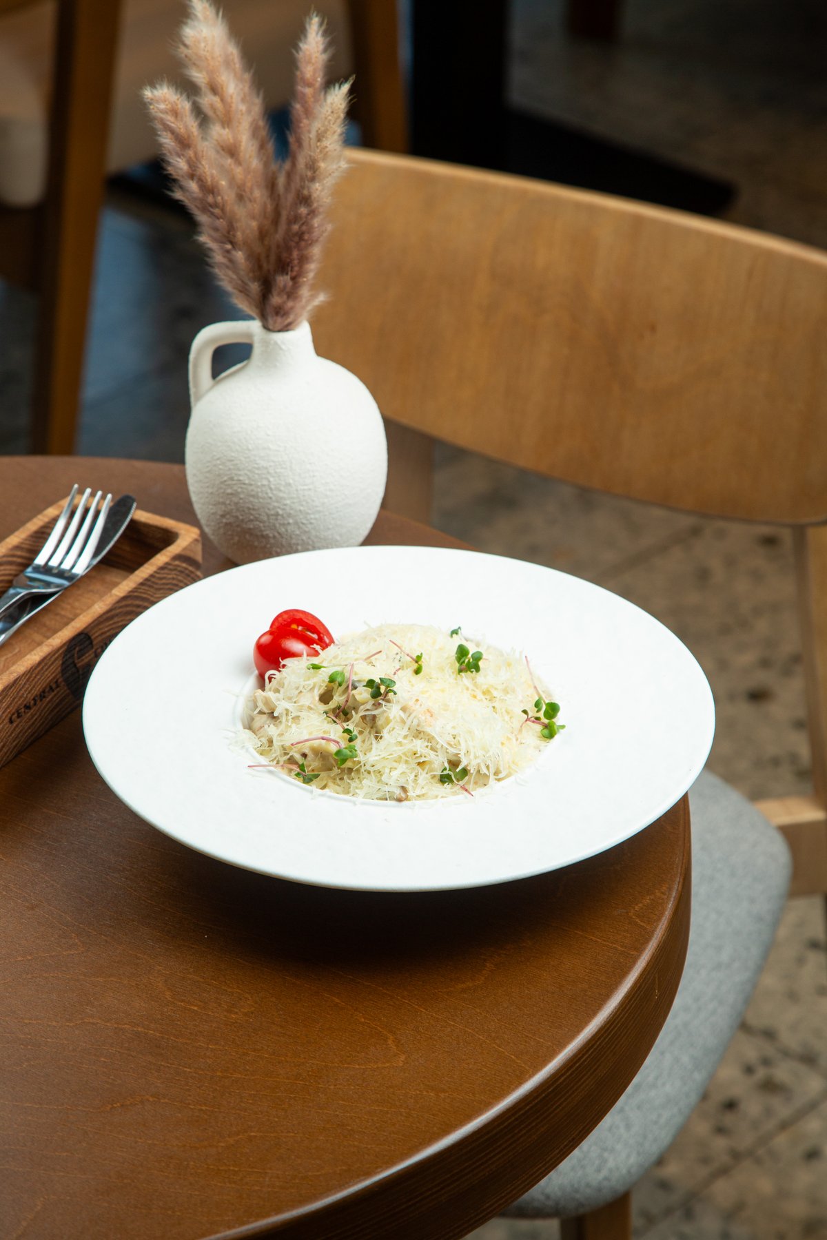 Подаётся со сливочным соусом, который добавляет блюду кремовую текстуру и насыщенный вкус.